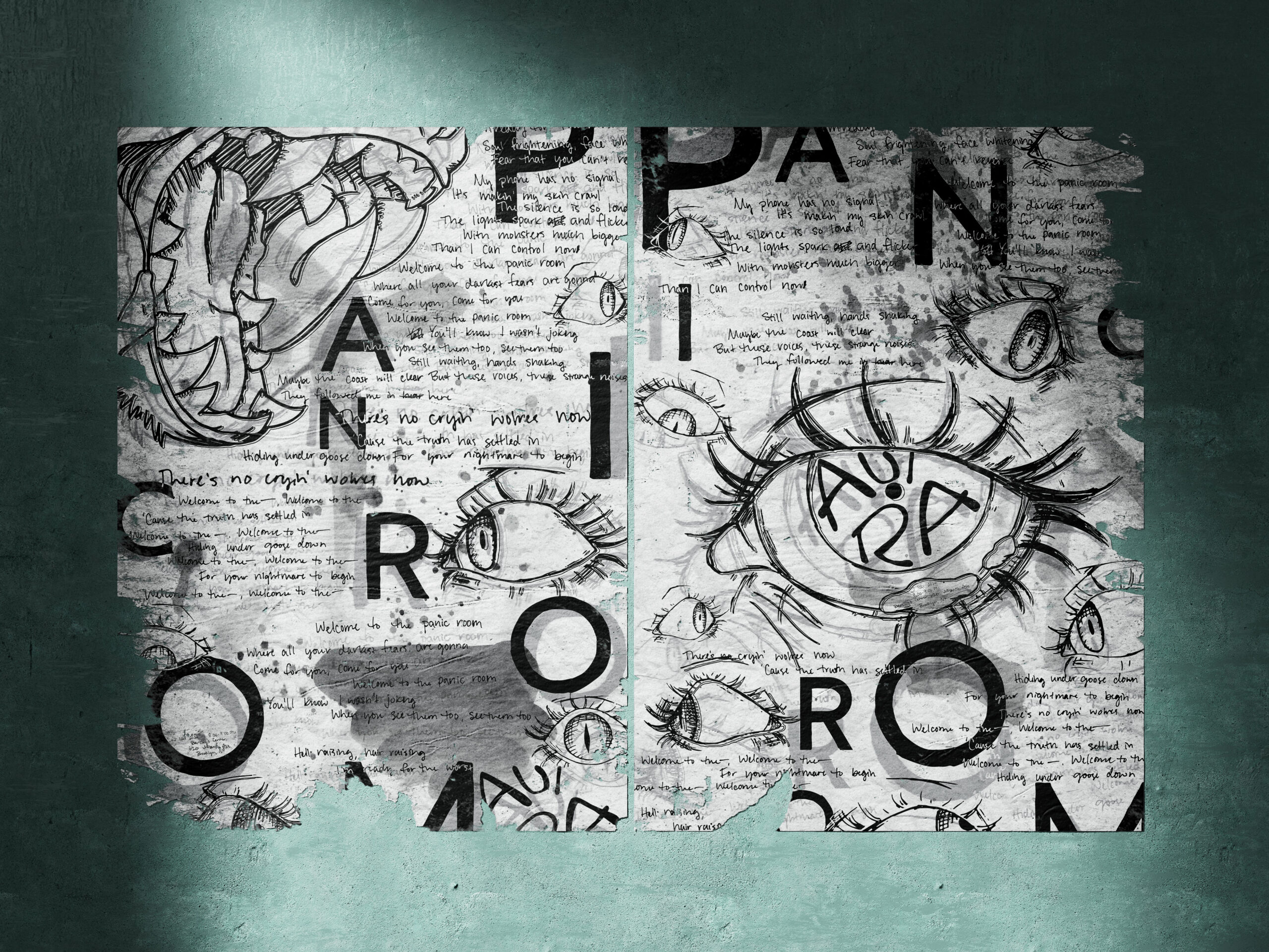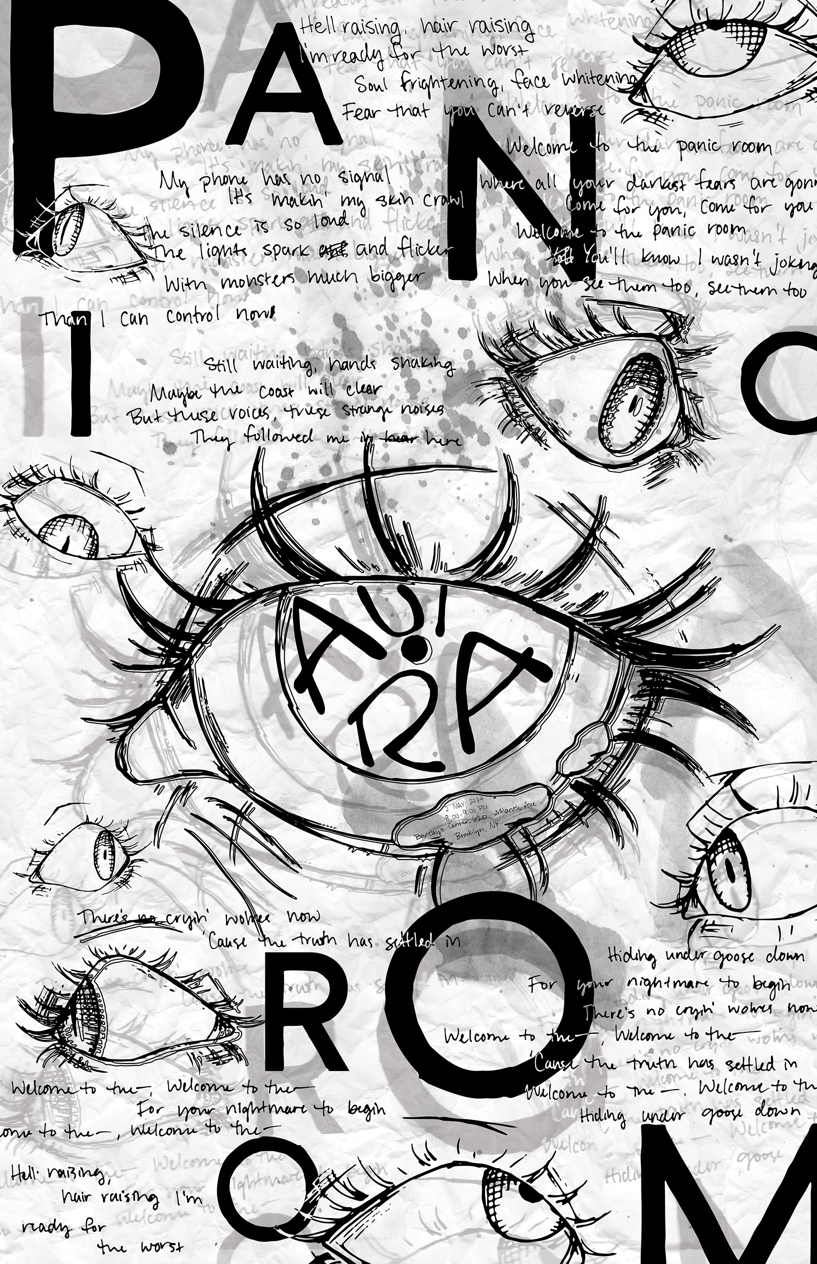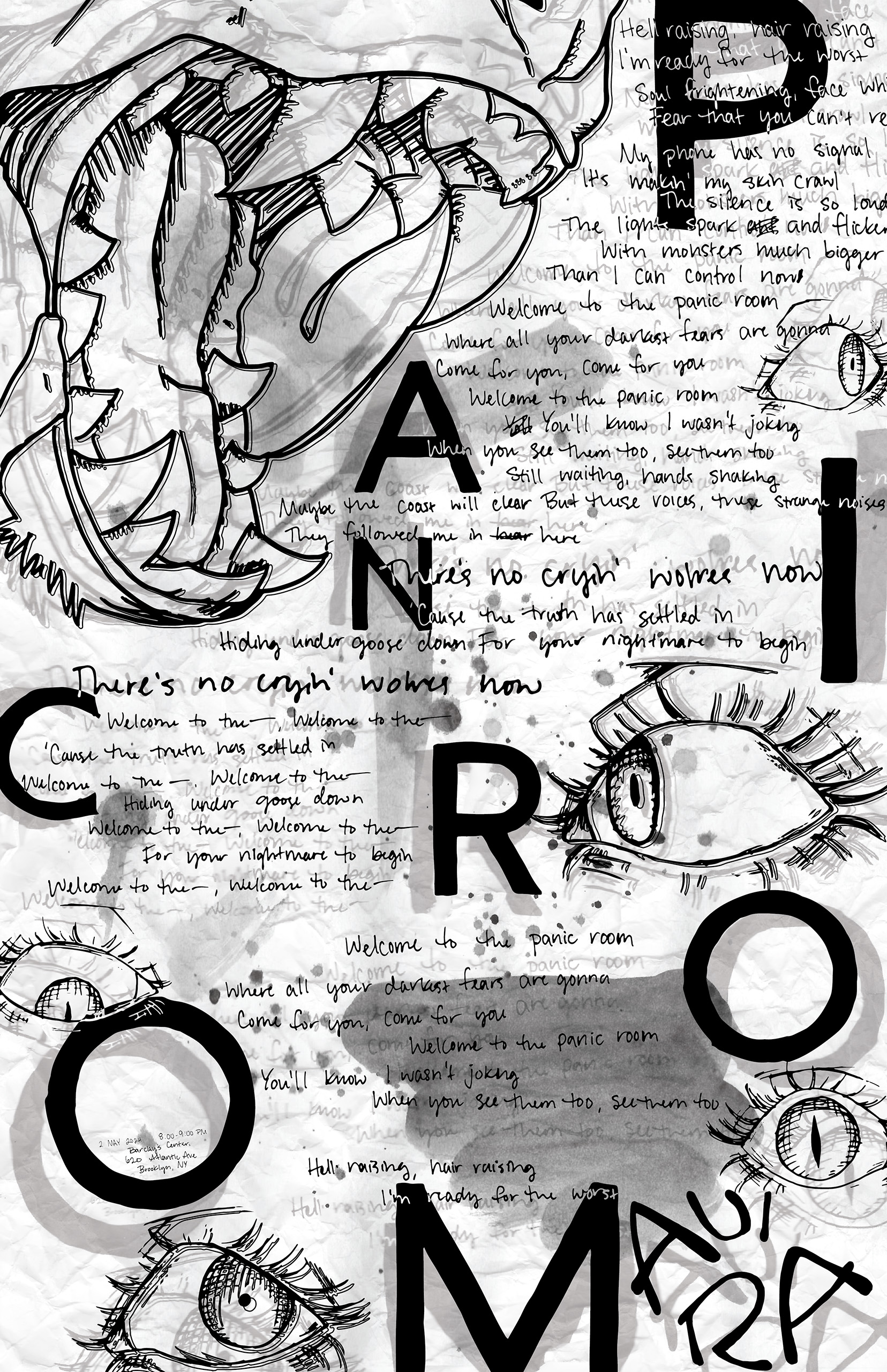 This project remains one of my favorites in both the process and execution. The artist is one I enjoy a lot because of the topics in her music, so I decided to base the posters on her song “Panic Room.” For this project, I went back to my roots in traditional media, illustrating all of the eyes and the wolf’s maw on pen and paper, crumpling it up to get a nice texture, and scanned it in to work with it digitally. I also made the ink splatters myself, adding to the chaotic and nerve-wracking nature of the posters.